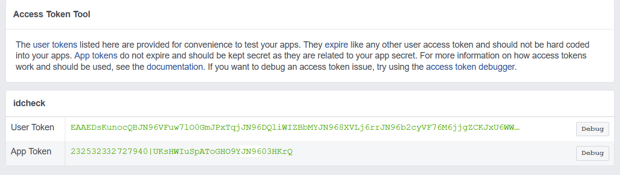 3. Click on debug option of the user Access Token of the app you have created. This will take you to the debug tool, where you can find all necessary information regarding short lived user Access Token.