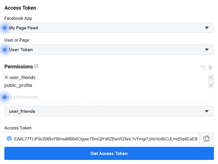 5. Select your Facebook App from the drop down menu, under 'Access Token' section and then select 'Get User Access Token' or 'Page Access Token' from the drop-down menu, under 'User or Page' section in the drop down