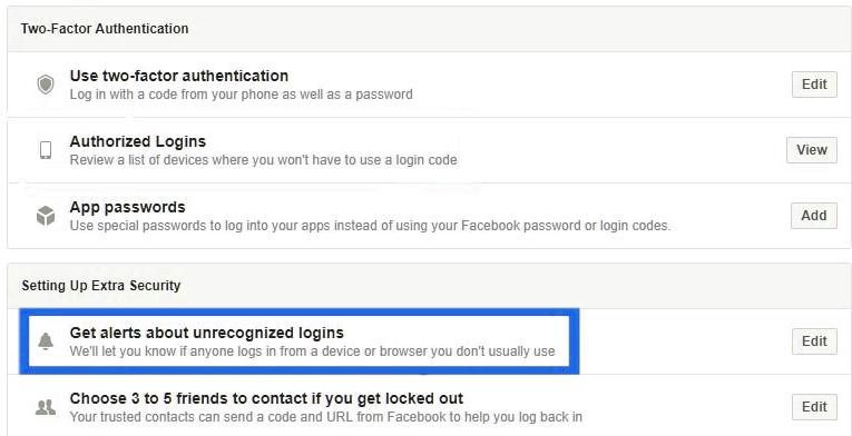 3. Scroll down to ‘Setting Up Extra Security’ section and click on ‘Get alerts about unrecognized login’