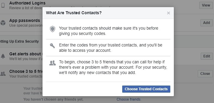 4. Clicking on this option will open the sub-menu, from which you have to click on ‘choose friends’. A pop-up window will open, explaining you what are trusted contacts. Click on ‘Choose Trsuted Contacts’.