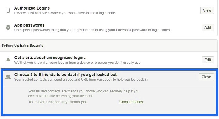 According to this feature, you to add trusted friends from your friends list as nominees, in case you got locked out of your Facebook account. These nominated friends can help you regain your Facebook account, in an unexpected event, like your Facebook account getting locked. Similarly, in case your Facebook account is hacked, and you are not able to log in to your account despite multiple attempts, your nominated friends can help you to log in to your account and update the security settings without much hassle. It is therefore an important feature in secure your Facebook account data.